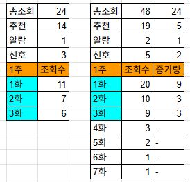 > 어쨌든 첫 주에는 코멘트도 달리고 조회수도 올라가니 개 싱글벙글 했을텐데 2주차 되니까 나오죠? 1화에서 컷 되고 있어요. 저번에 제가 쓴 글 기억하시는지. 조회수 1은 글쓴이가 올릴 수 있다는 거. 사실상 5화 후로 안 올라가고 있어요. 종우는 빡대가리에 붕어대가리니까 자기가 1 올려놓고 잊어버렸을 지도 모르겠는데. 어쨌든 조회수가 안 오르는 것은 사실입니다. 아에 뒤로는 달리지도 않죠.