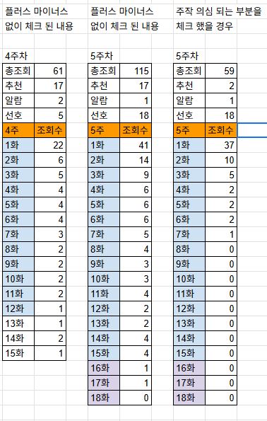 - 지금까지 계속 매 주 '의심된다' 라는 내용과 함께 조회수 조작이 있었다고 생각하는 '2인 분' 정도를 제외하고 체크를 진행 했습니다만, 이번에는 확실히 하고자 합니다. 그래서 4주차에 제가 의심 된다고 체크 제외 한 2인 분을 일단 다시 돌려놨고, 5주차 조회수 역시 다시 사이트에 찍힌 그대로 찍었습니다.