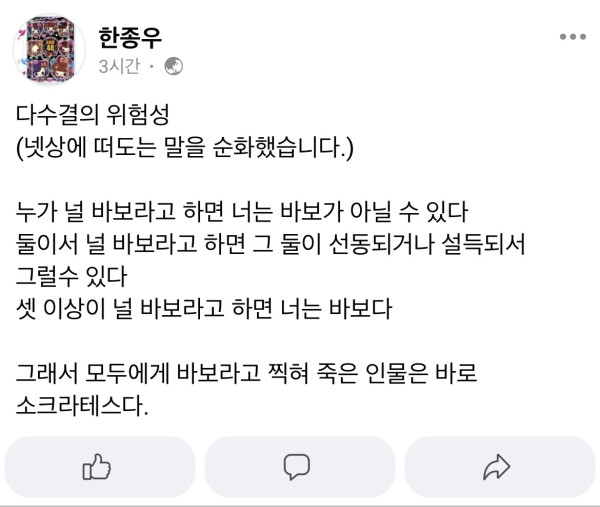 씨발 지가 무슨 소크라테스야. 그냥 좆병신새끼지. 아 그래 소크라테스 해라. 키보드 소크라테스. 하는 김에 키보드 여포. 키보드 제갈량도 하고. 후… 아직 덜 쳐맞았나. 왜 이래? 암튼