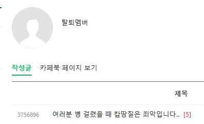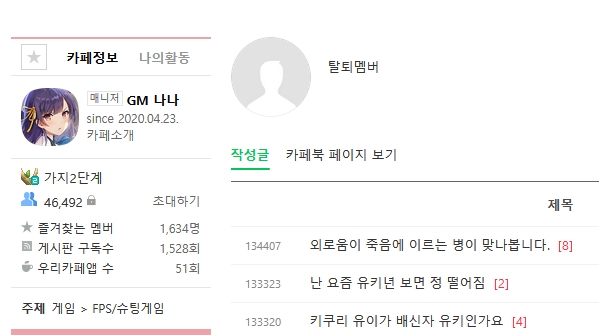 걸카페건 역시 '또 탈퇴'한 상태. 그것 만이 아니라 '깽판 칠 때 글'을 모두 지웠음.