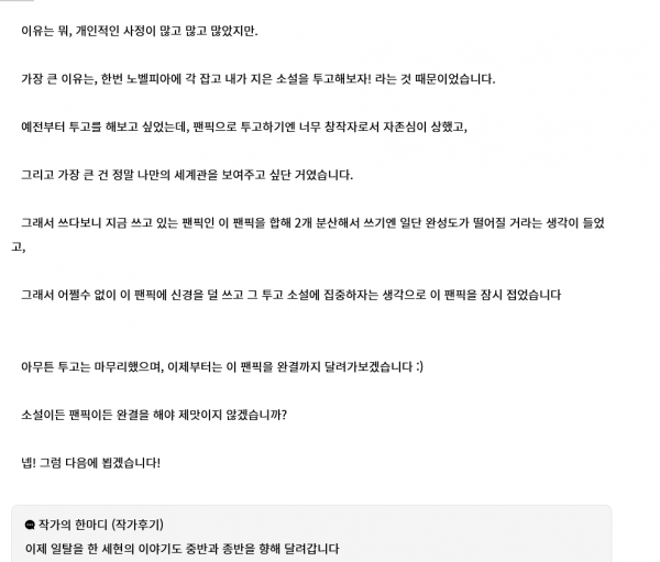 설마 그거 다시 쓰고 있나요? 창작자로써 자존심 상했다라. 언제 부터 썼는지 몰라도 뭐 장편소설 쓰셨어요?