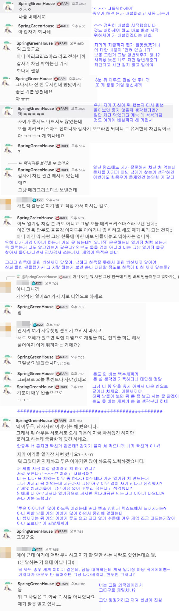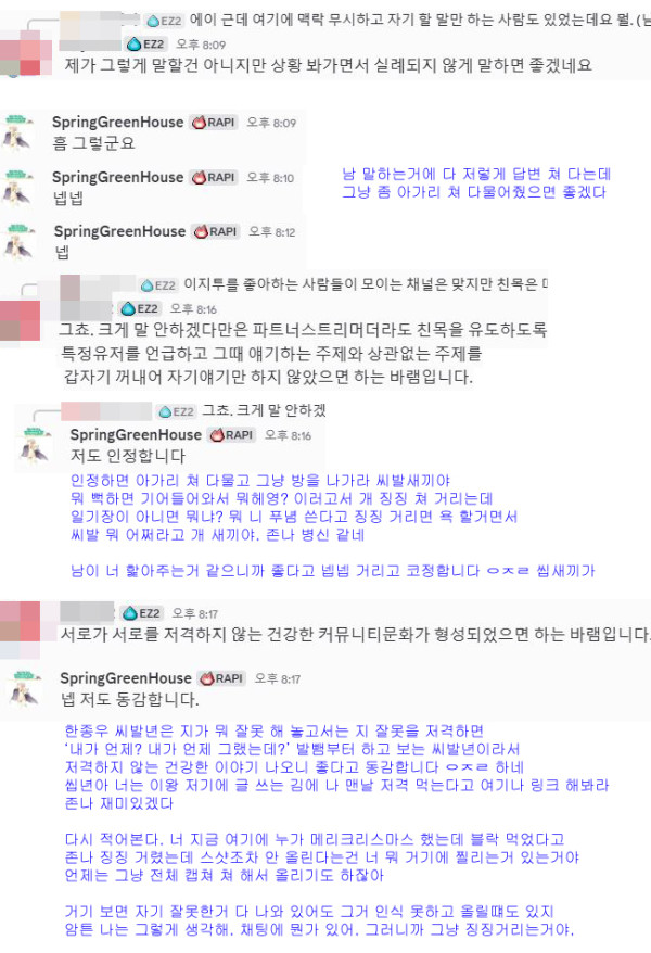 지가 디스코드방을 게임이야기 안하고 일기장처럼 쓰는거 객관화해서 이야기 안하고 존나 삔또 상한다는 식으로 이야기 하는거 텍스트에서 다 느껴집니다. 존나 역겹네요