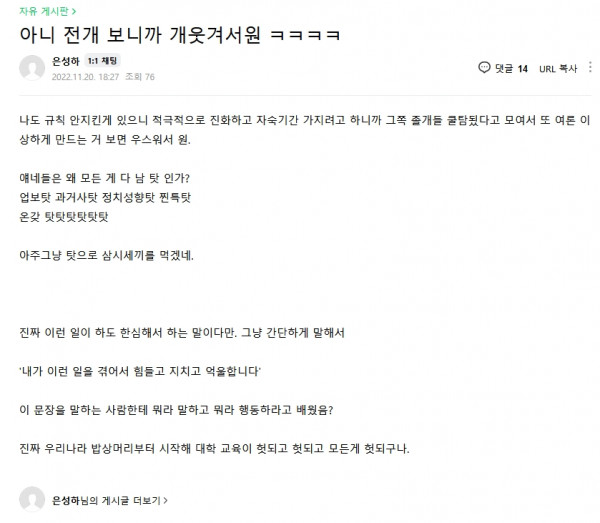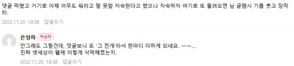 일단 링크 보면서 댓 달린거 하나씩 보는데 매번 똑같은 레퍼토리에 지 듣기 좆같은 말 있으면 응 그짝~하는데 저것도 패턴 우려먹을걸 우려먹어야지.
