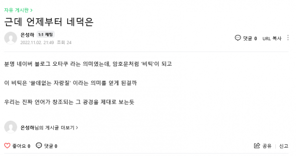 대체 인터넷 망령생활하면서 인터넷에서 무슨 단어를 보길래 비틱이라는 단어를 몰라서 네덕비틱 그렇게 쓴거지.