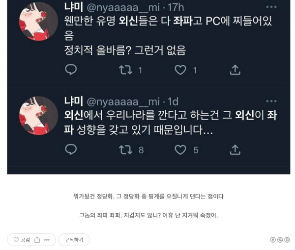 남이 좌익을 하던 뭘 하던 알바 아닌데 니는 절대 안되지. 꺼져 좌익 빨갱이 새끼야.
