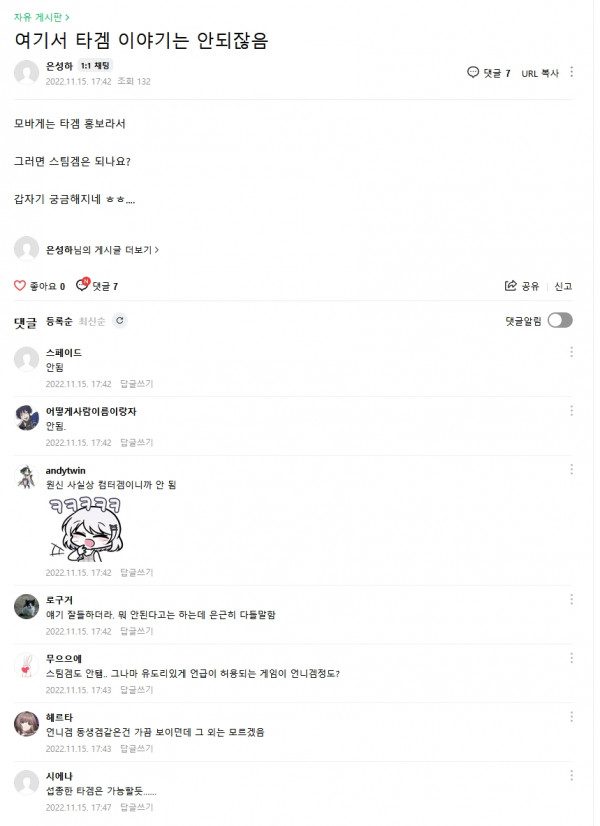 "타겜 이야기 좀 그렇다만" 식으로 '종합'게임채널도 아니고 '특정'게임카페 인데 꼭 딴 이야길 하고 싶어서 안달나 있음.
