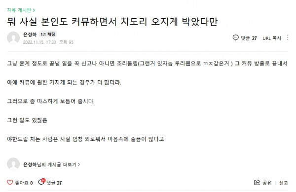 강건너불구경 작성일그냥 디시에서 윾동으로 활동하면 적어도 타겟 될 일도 없을텐데