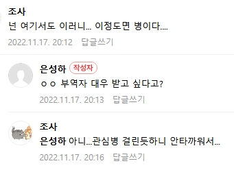 - 다음글(22.11.15) '은성하'님은 성적발언을 어디서 해야하는지 전혀 모르는거 같다. 22.11.15