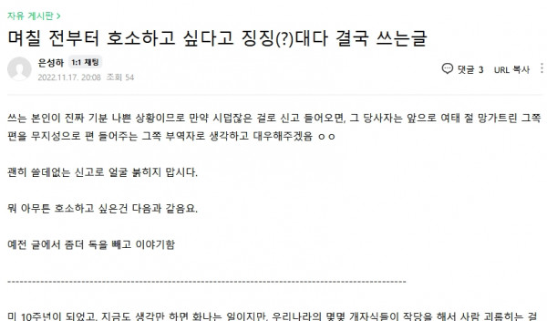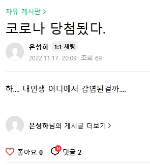 근황글 (22.11.17) '은성하'님 아무도 관심 없는 호소는 노잼이고, 우한폐렴 당첨 된거나 축하해줍시다