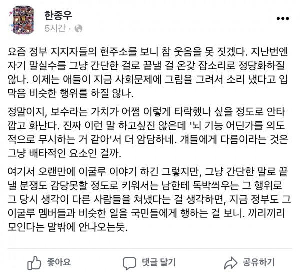 - 종가새끼 싱글벙글하게 만든 현 정권을 비난한다.