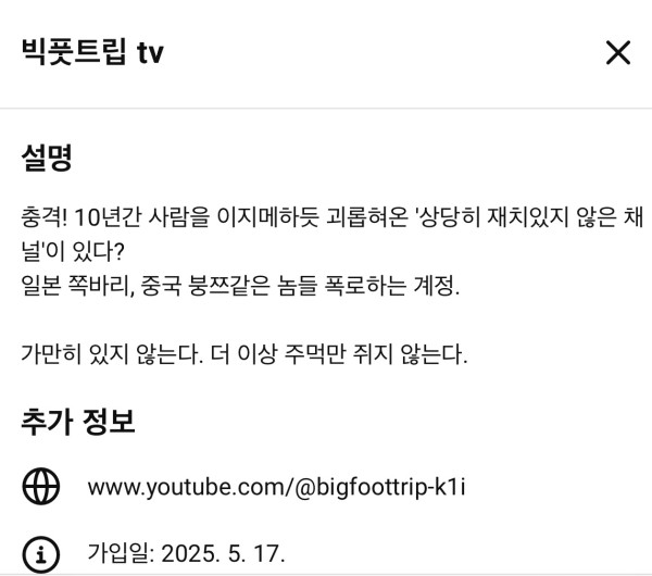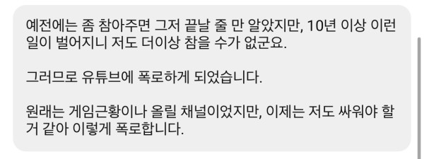 25년 5월에 계정 새로 만들어서 돌아왔습니다. 몇개월 묵힌건지 뭔지 모르겠는데, 영상 올린건 대충 이번 주 월요일이고. 폭로한답시고 떠드는 내용은 대강 1년 전에 올린 내용. 이제는 재미도 감동도 없는 그냥 씹노잼. 분초 단위 기억상이랑 비슷한게 그냥 안보고 스킵 ㅇㅇ