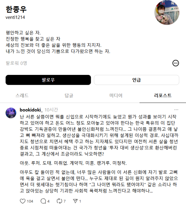 근황글 (250816) 한종우 병신좌빨새끼 리포스트 한거 봐라 ㅋㅋㅋㅋ