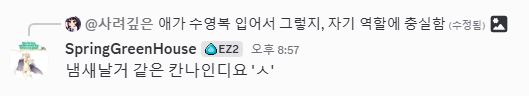 리듬게임 디스코드인데 타게임 이야기에 반응하는거 존나 웃기기도 하고요. 진짜 게임 안하는 분탕 새끼 ㅋㅋㅋㅋ 그 주제에 맞는 곳에서 그 게임 이야기 하는 꼬라지를 거의 못 봄. 99% 정도? 1% 정도는 말 할 때 있고