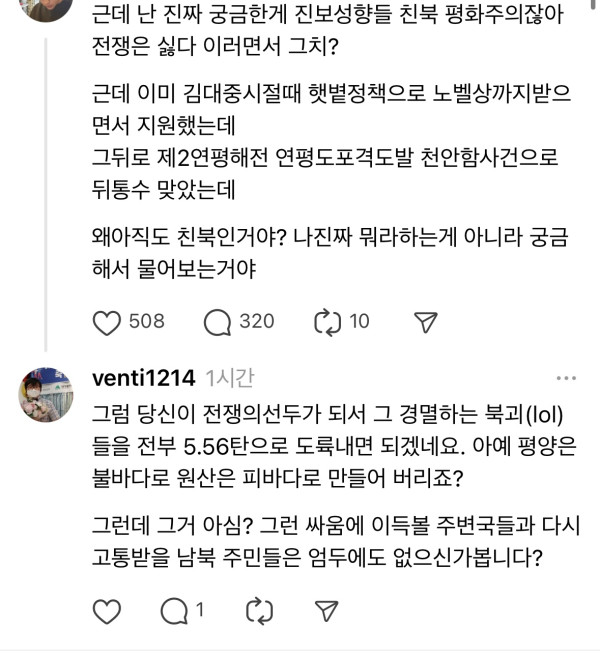 - 는 뭐 수꼴은 죽어야한다느니, 피떡으로 만들어버린다느니. 철퇴로 내리 치려고 하는 망상이나 싸지르고. 누구보다 폭력과 살인을 사랑하는 방구석 십덕 새끼가 너가 사랑하는 조국인 ‘조선 민주주의 인민공화국’ 이 공격 받는다고 생각하니 치가 떨리냐?
