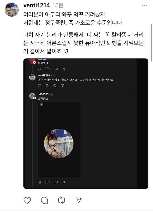 ㄱㄴㄷㄹ 작성일스레드는 나이 많은 사람들이 많던데 거기 가서 또 지 버릇 못 버리고 자기보다 연장자들에게 깝죽대고 있나보군요