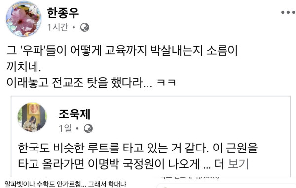 딴건 모르겠는데, 지랑 상관 없은지 15년은 넘지 않았냐? 교육을 망쳤다느니 어쩌구. 위에도 적었듯이 이 새끼 그냥 건수 잡히니까 개소리하는거고. 넌 왕따 당할 만 했다. 시발 거긴 담당일진 없었냐?