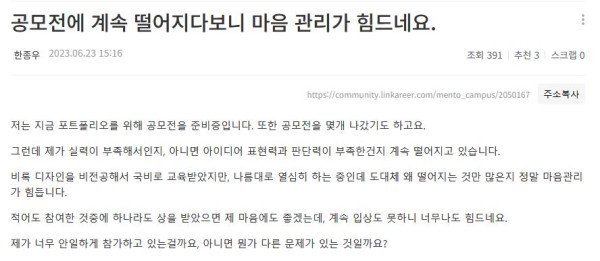 공모전에 계속 떨어지다보니 마음 관리가 힘드네요.