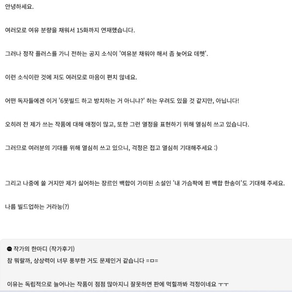 작가는 여유 분량을 채워 15화까지 연재했으나 공지가 늦어져 독자들에게 미안한 마음을 전합니다.