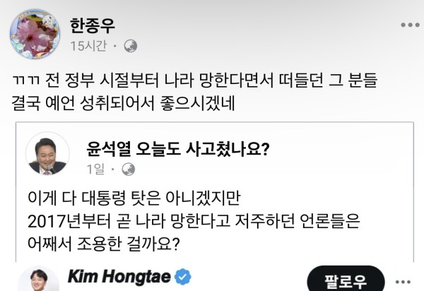 전 정부 시절엔 “문발놈 좀 믿어!!” 하면서 야랄하던 새끼가 정부 바뀌니까 손바닥 뒤집듯 나라 망하라고 기도 중 ㅋㅋ
