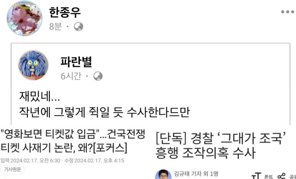 근황글 (240217) 퍄 우리 종우행님 기분 드러우신갑다