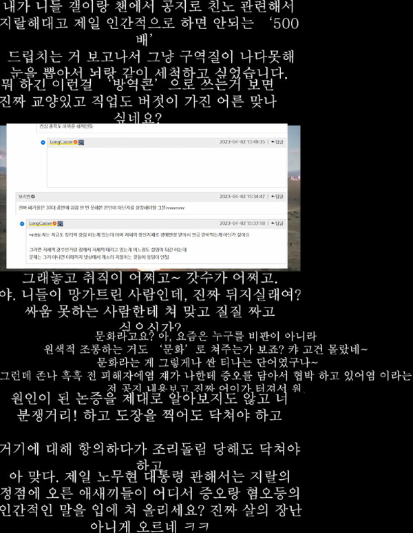 내가 니들 갤이랑 챈에서 공지로 친노 관련해서 지랄해대고 제일 인간적으로 하면 안되는 '500배'