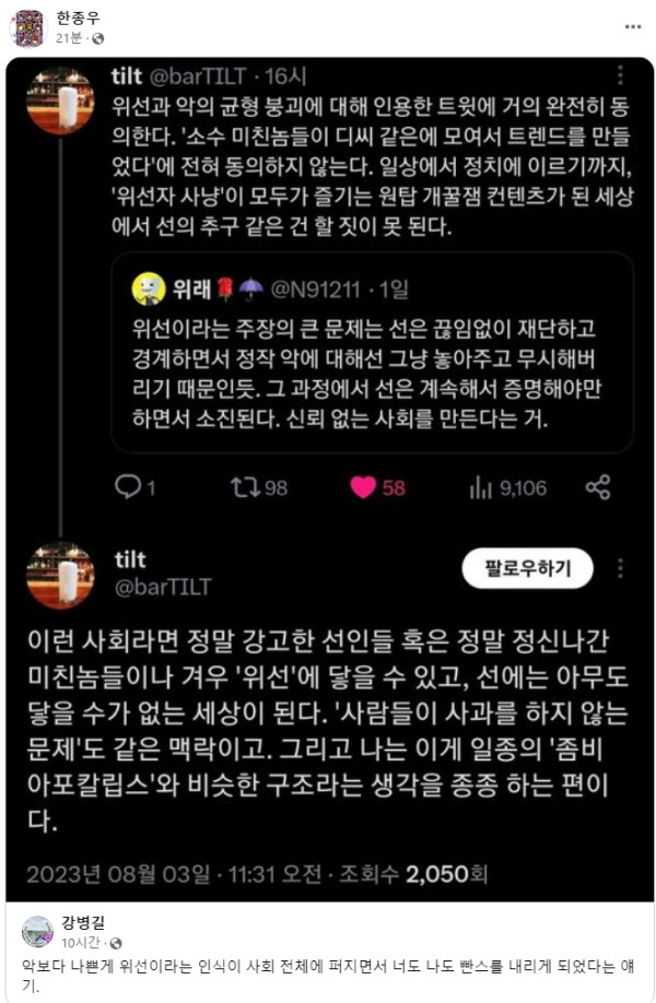 2. 디씨의 위선자 사냥 어쩌구 하는 거 트윗 가져와서 '야게 코답이지' 이런 소리 안 쓰고 그냥 박제 해 놨네요. 그래서 지금 한종우(안세현) 당신이 위선자 사냥 당한다고 생각함? 악으로 똘똘 뭉친 씹새끼가 당신 아니고? 존나 웃긴 새끼네.