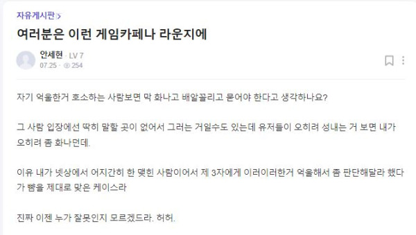 그 사람 입장에선 딱히 말할 곳이 없어서 그러는 거일수도 있는데 유저들이 오히려 성내는 거 보면 내가 오히려 좀 화나던데.