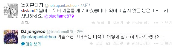 저거는 저도 본 기억이 나네요. 뭐냐면 트위터를 한번 날렸어요. 맞아 생각났다. 그 태극기 달고 있는거(애국자인 척 하는거 개 역겹다) 근데 그 뒤에 다시 들어왔단 말이죠. 들어와서 저렇게 지가 RT 해 놓고 당사자가 발견하니까 "어케 알았대?" 이 지랄 ㅋㅋㅋㅋㅋㅋㅋㅋㅋㅋㅋㅋㅋㅋㅋ 돌아버리겠다 진짜. 어떻게 저런 지능으로 대학에 들어간거고 대학을 졸업한거지. 최근에도 관련해서 이야기 오가는 거 듣긴 했는데.