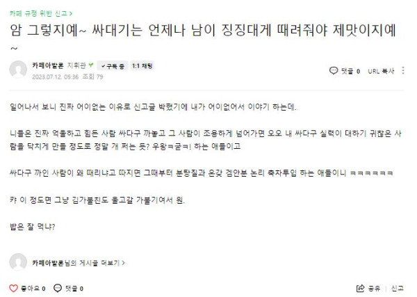 근황글 (230712) 아침 5시에 비난 받고 전력으로 아침부터 풀발기하는 야페코발론(33살)
