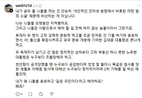 돌아가신 두 분 불러내서 쉴드로 쓰고 있네. 이런 미친 새끼가 있나. 셀프로 패드립 치더니