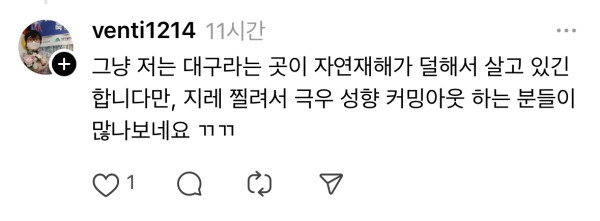 신기한게, 저 1줄의 내용이 앞 뒤가 안 맞아요. 읽어보세요. 여기는 저 새끼만 대상으로 한 곳이라 다른거 다 잘랐는데, 저것 만 놓고 보면 무슨 주제로 저런 말이 나온건지 알 수가 없어요.