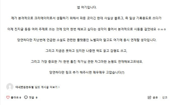 가보니까 뭐 재작년엔가 자기가 노벨피아에 똥글싼다고 그 지랄하던거 또 1화부터 저기다가 싸지르기 시작하고서 그거 좀 읽어달라고 홍보하고 자빠졌음. 그냥 뒤져 새끼야. 진심으로 이번 기회에 홍보글 싸는거 자르고 강퇴시켰으면 좋겠다