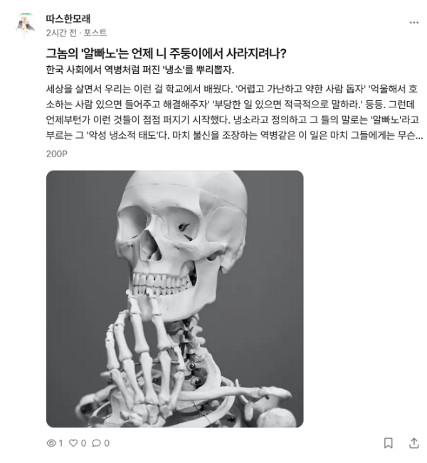 ㄱㄴㄷㄹ 작성일근데 포스타입 들어가서 보니 알빠노고 뭐고 가독성이 떨어져서 읽기 힘들어서 그냥 나왔습니다. 란도야 글쟁이면 글을 좀 잘 써라.
