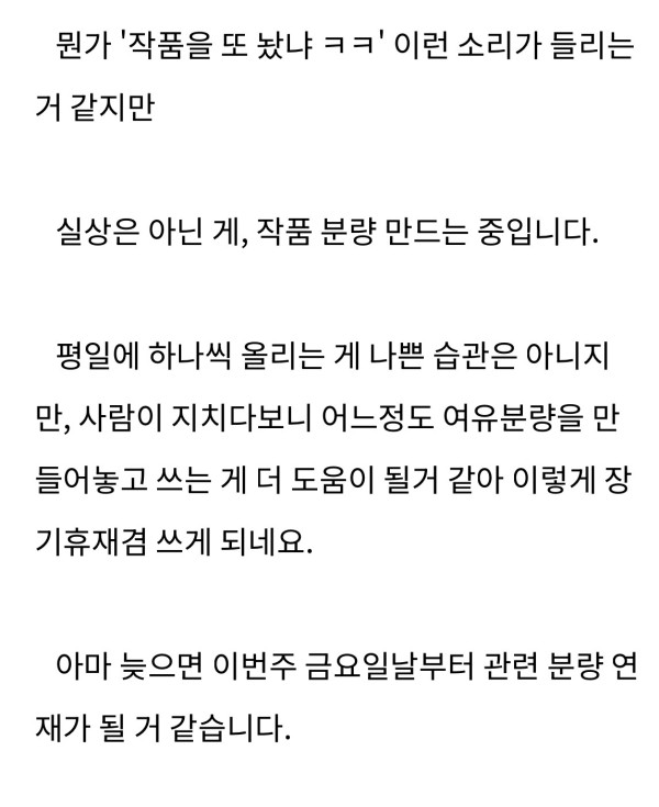 - 무슨 말인지 모르겠습니다. 누가 평일 5일간 연재 하라고 칼 들고 협박했냐? 여기서 습관이라는 단어가 왜 나오는지 모르겠고요. 진짜 뭔 개소린지?