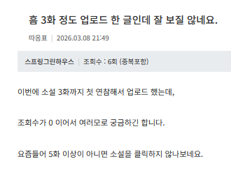 근황글 (260308) 흠 3화 정도 업로드 한 글인데 잘 보질 않네요