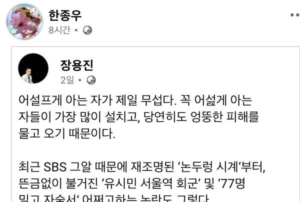 - 글의 본 내용은 재껴두고 지금까지 한종우가 ‘잘 아는 게’ 있었나? 빡대가리련이 아는거 하나 없는 주제에 ‘아는 척’ 떠들면서 자신이 대화의 중심이 되려하고 이끌려고 하다가 탈탈 털린게 문제지