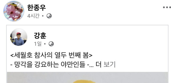 - 한종우에 대해서라면 ‘악어의 눈물’ 내가 이 새낄 종북좌익빨갱이라고 딱지 붙이고 까는게 천안함. 연평도해전은 절대 입도 뻥긋 안하고 오히려 그게 거짓이라고 선동 하던 과거 이력이 있음. 그런 새끼가 세월호는 ㅅㅂ… 실질적으로 자기가 지지하는 ‘당’에 도움이 되니까 저러는거지