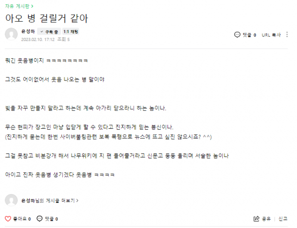 근황글 (23.02.10) 각설이보다 더 추한 새끼가 돌아왔다!