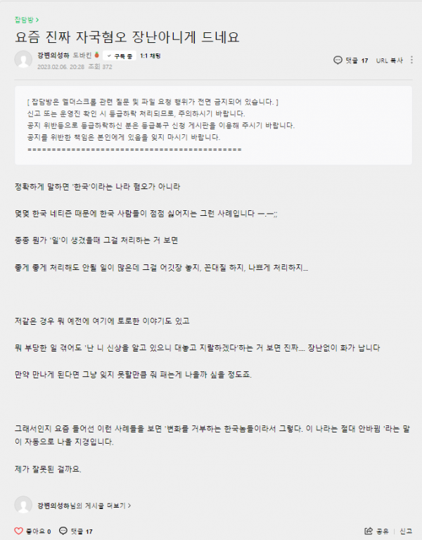 자국혐오원인 : 지가 존나 개 까여서